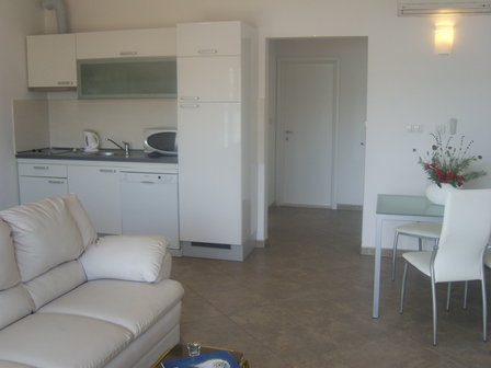 The apartments have 3 stars (***) and place for 4 persons. Size of apartment is 50m2, 1 bedroom with double bed, bathroom, dining room, living room with double bed and also a leather sofa, a kitchen (it has a dishwasher) and a terrace overlooking the sea. All furniture is new. Towels changing every 3-4 days.